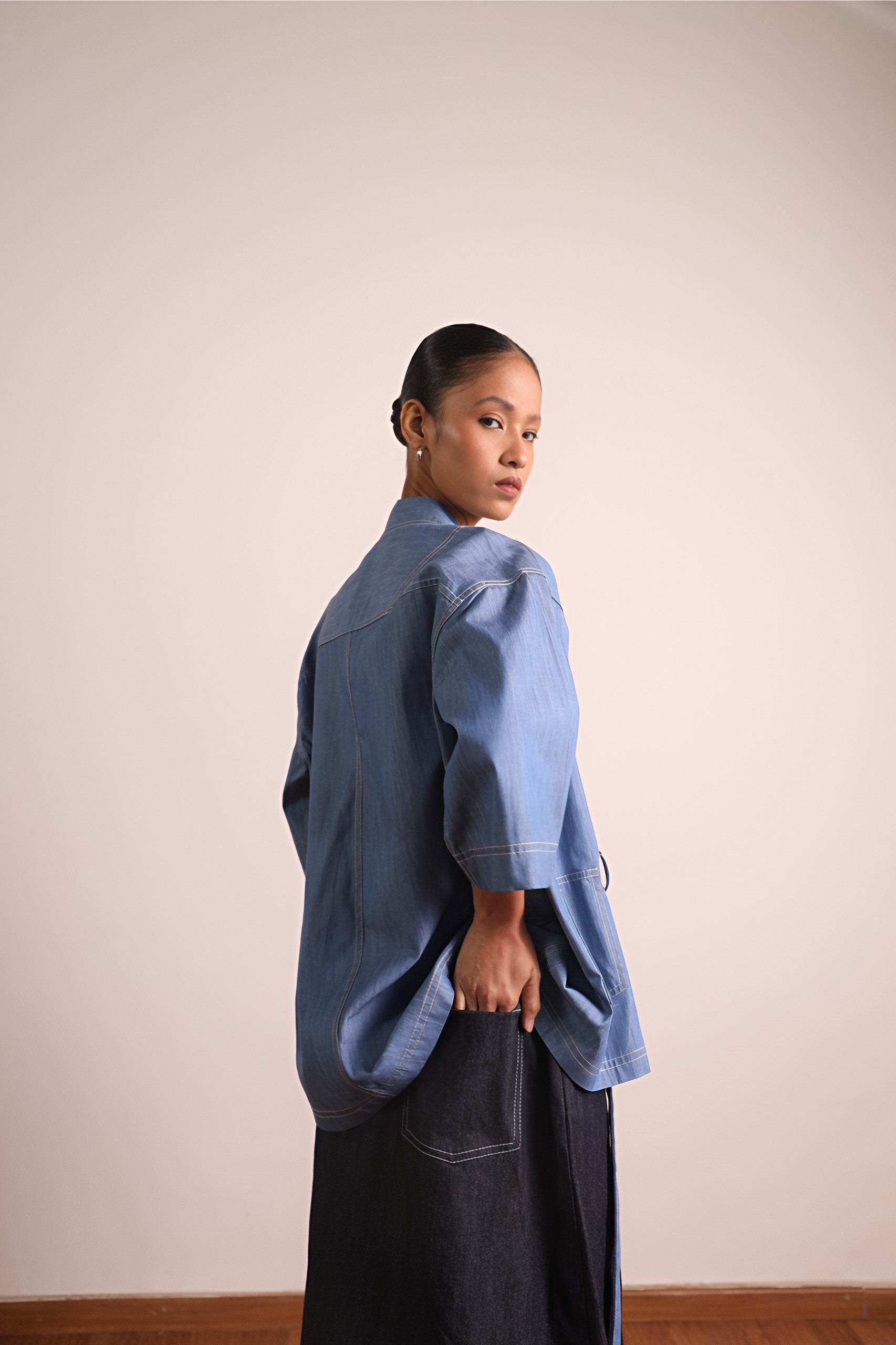 The Wraparound Denim Utility Kimono is a true‑waist silhouette designed for everyday ease.