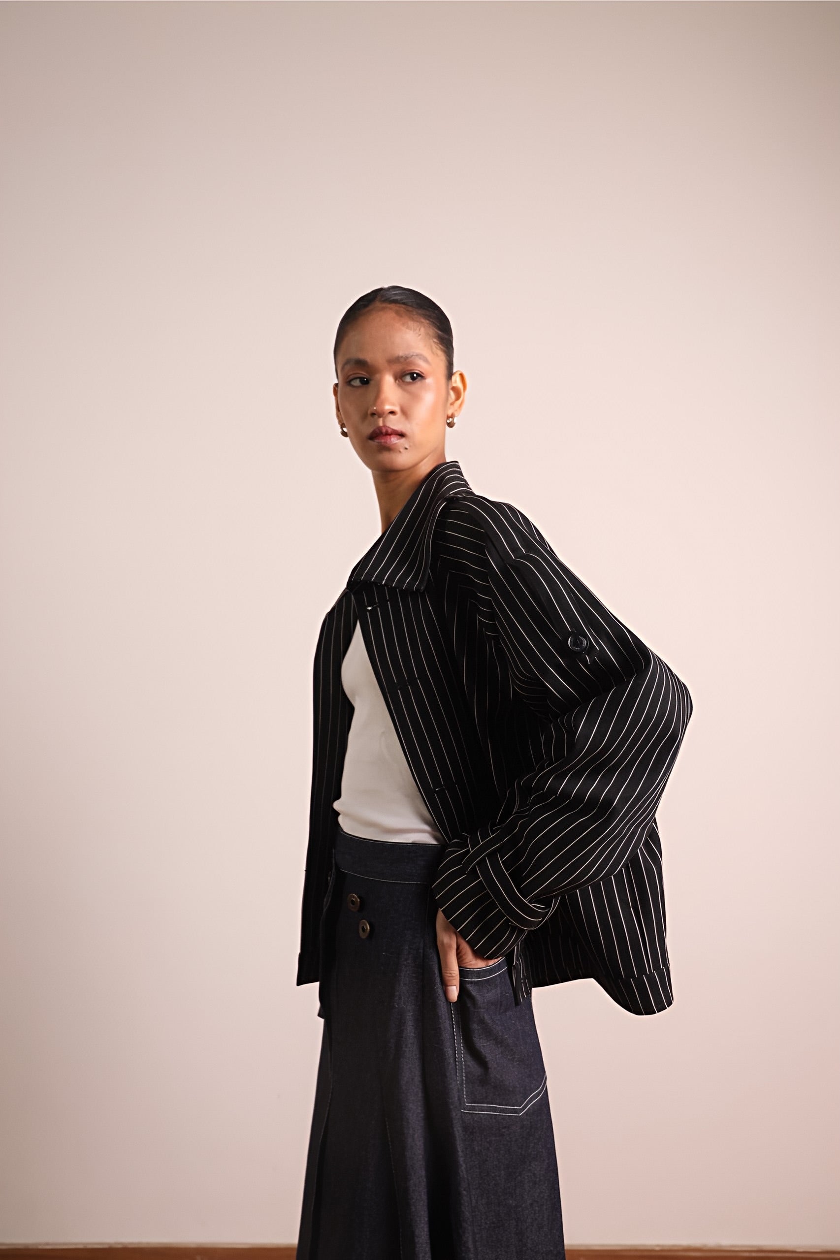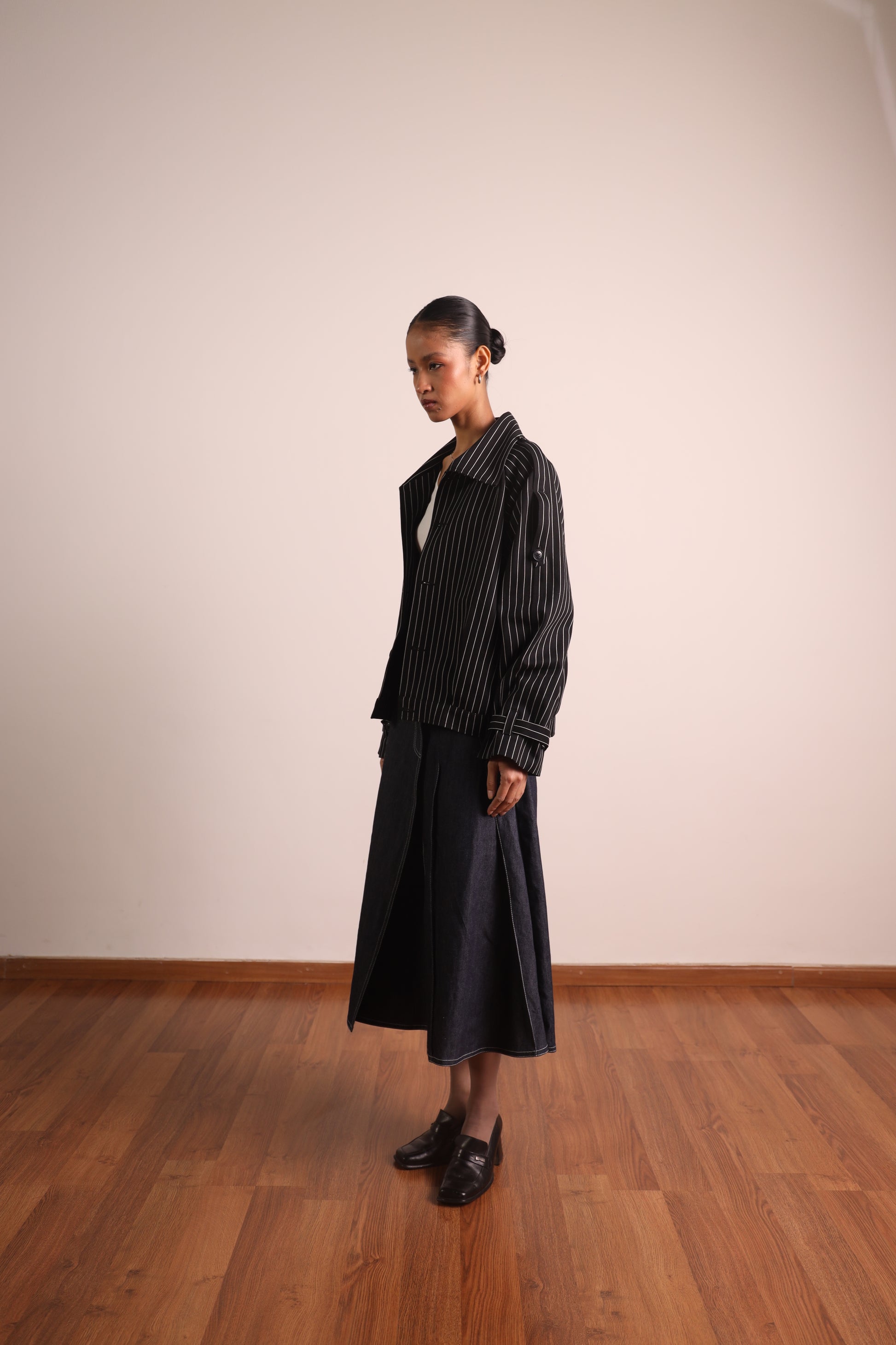 The Pleated Wraparound Denim Skirt is a true‑waist silhouette designed for everyday ease.