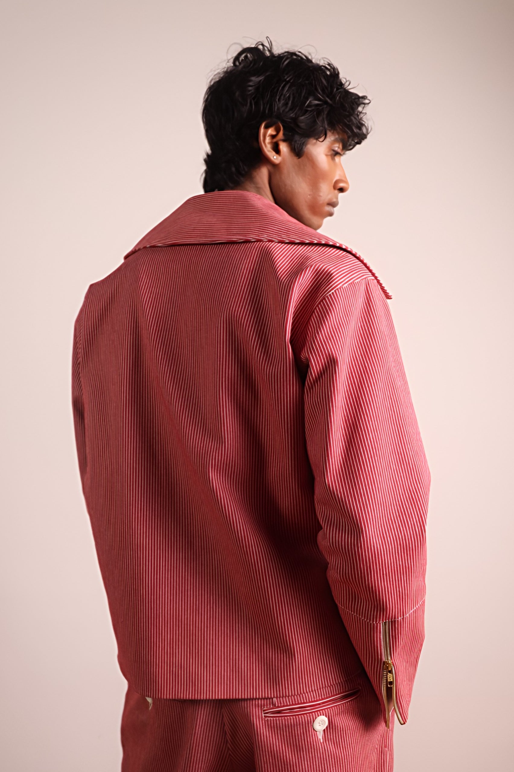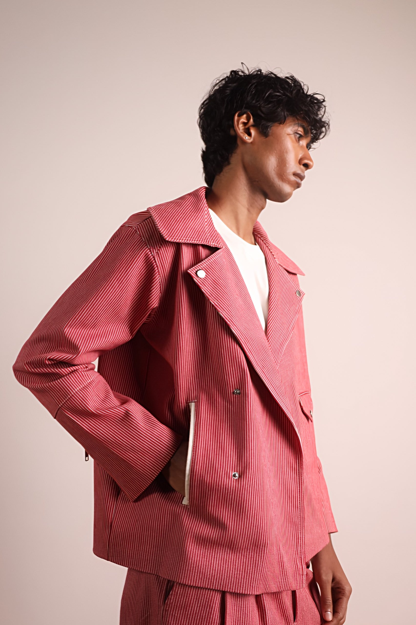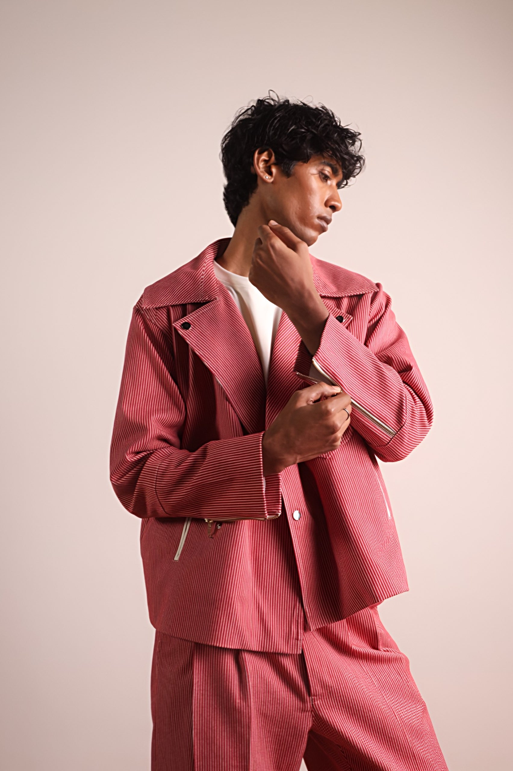 The Striped Denim Biker Jacket is a modern interpretation of a classic outerwear staple.