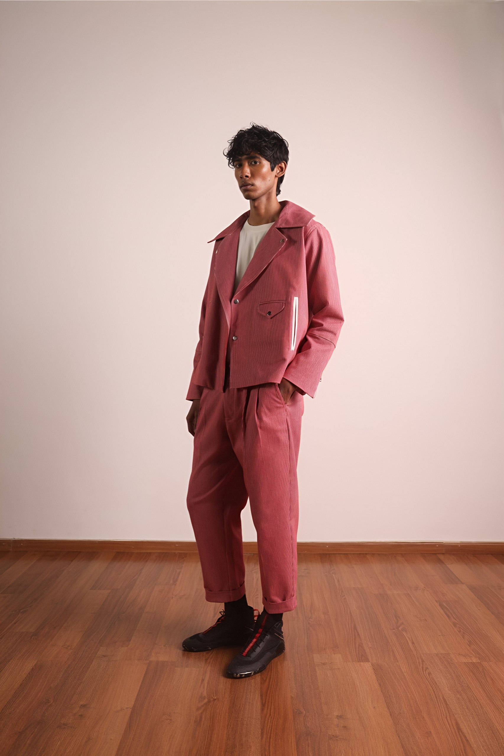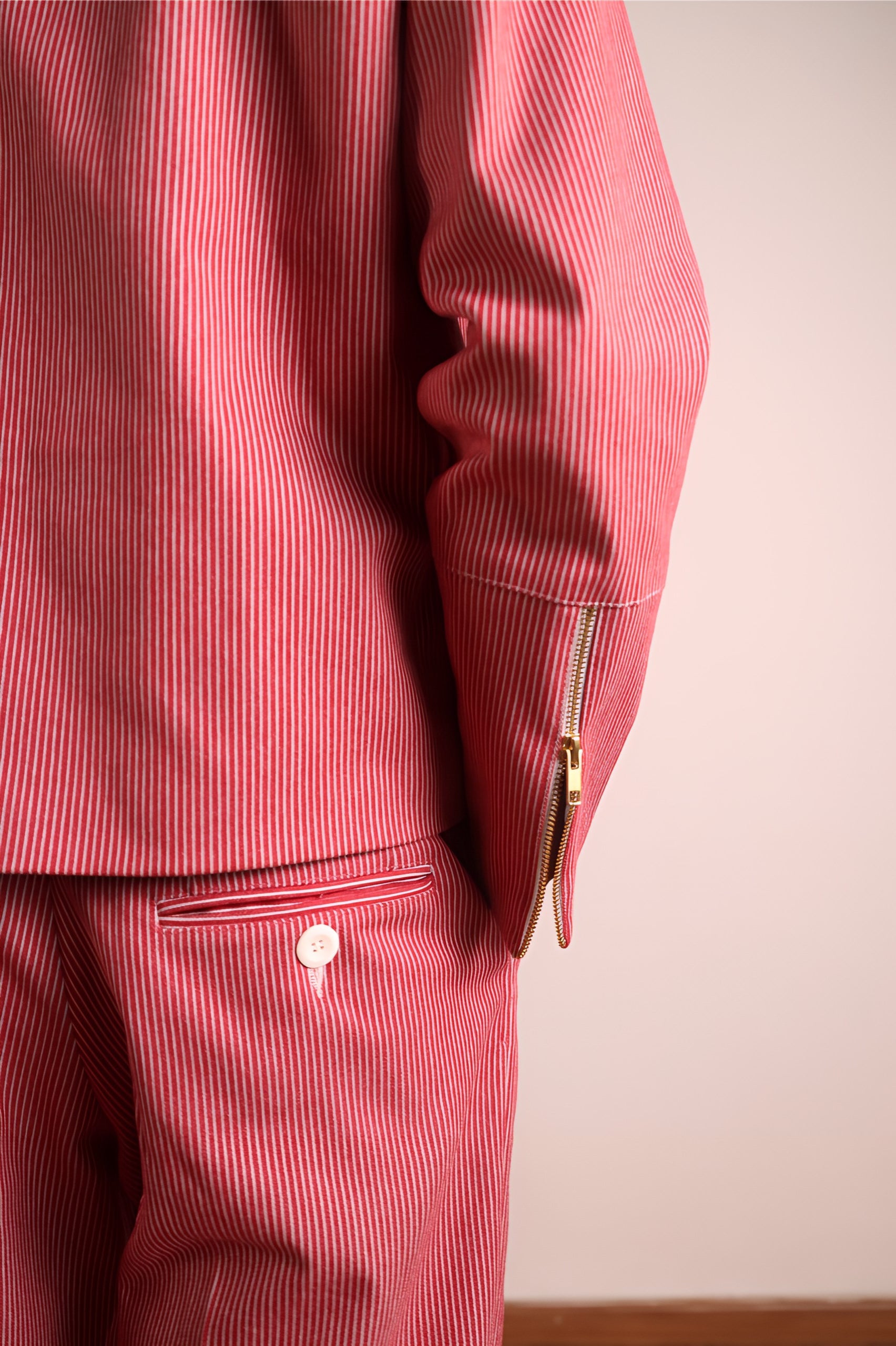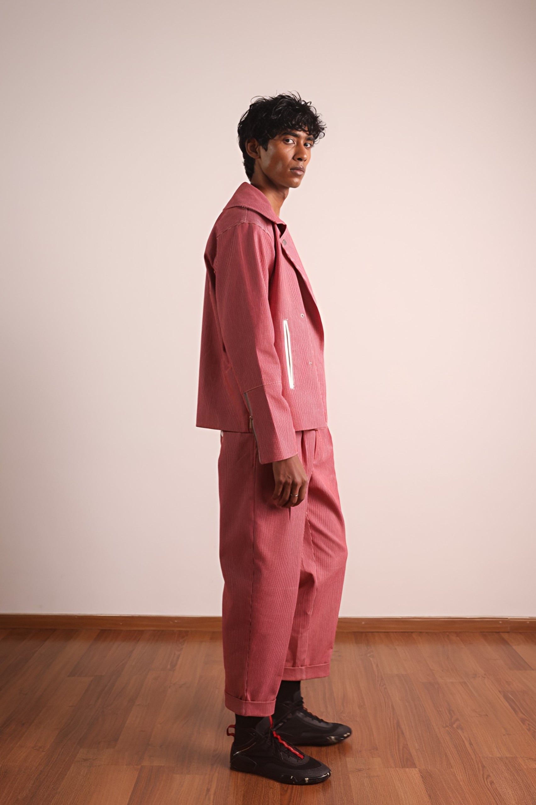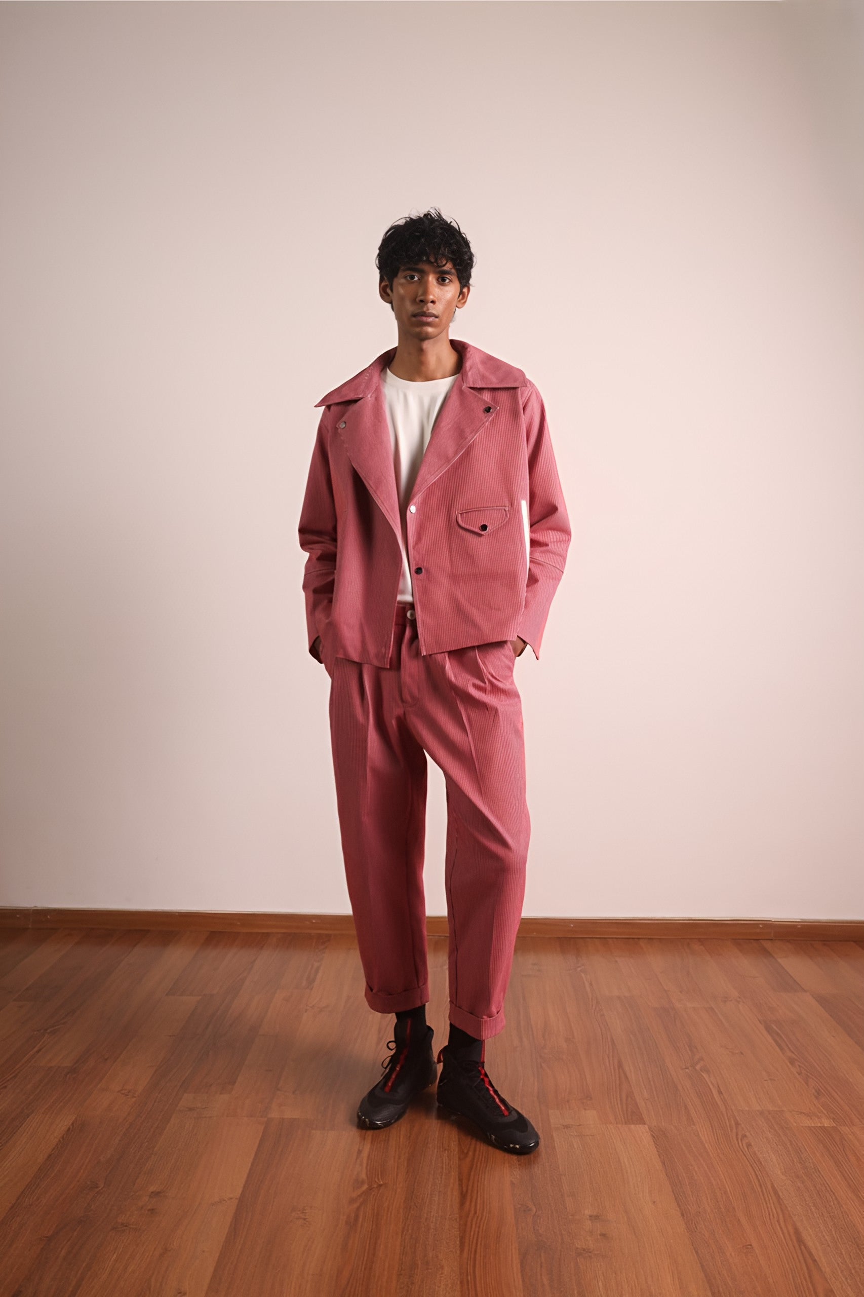 The Striped Denim Biker Jacket is a modern interpretation of a classic outerwear staple.