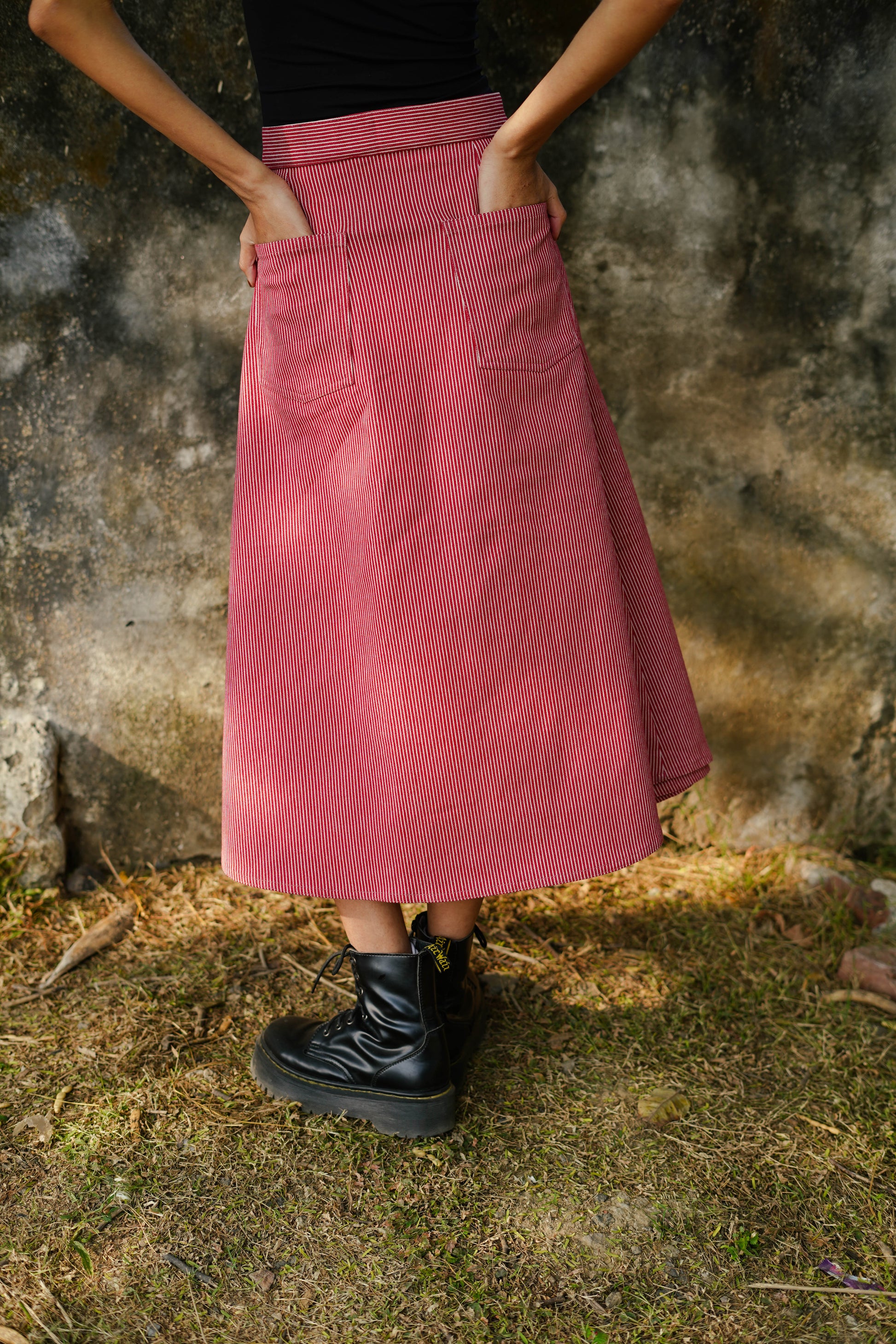 The Strawberry Denim Striped Wraparound Skirt is a true‑waist silhouette designed for everyday ease.